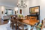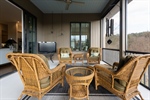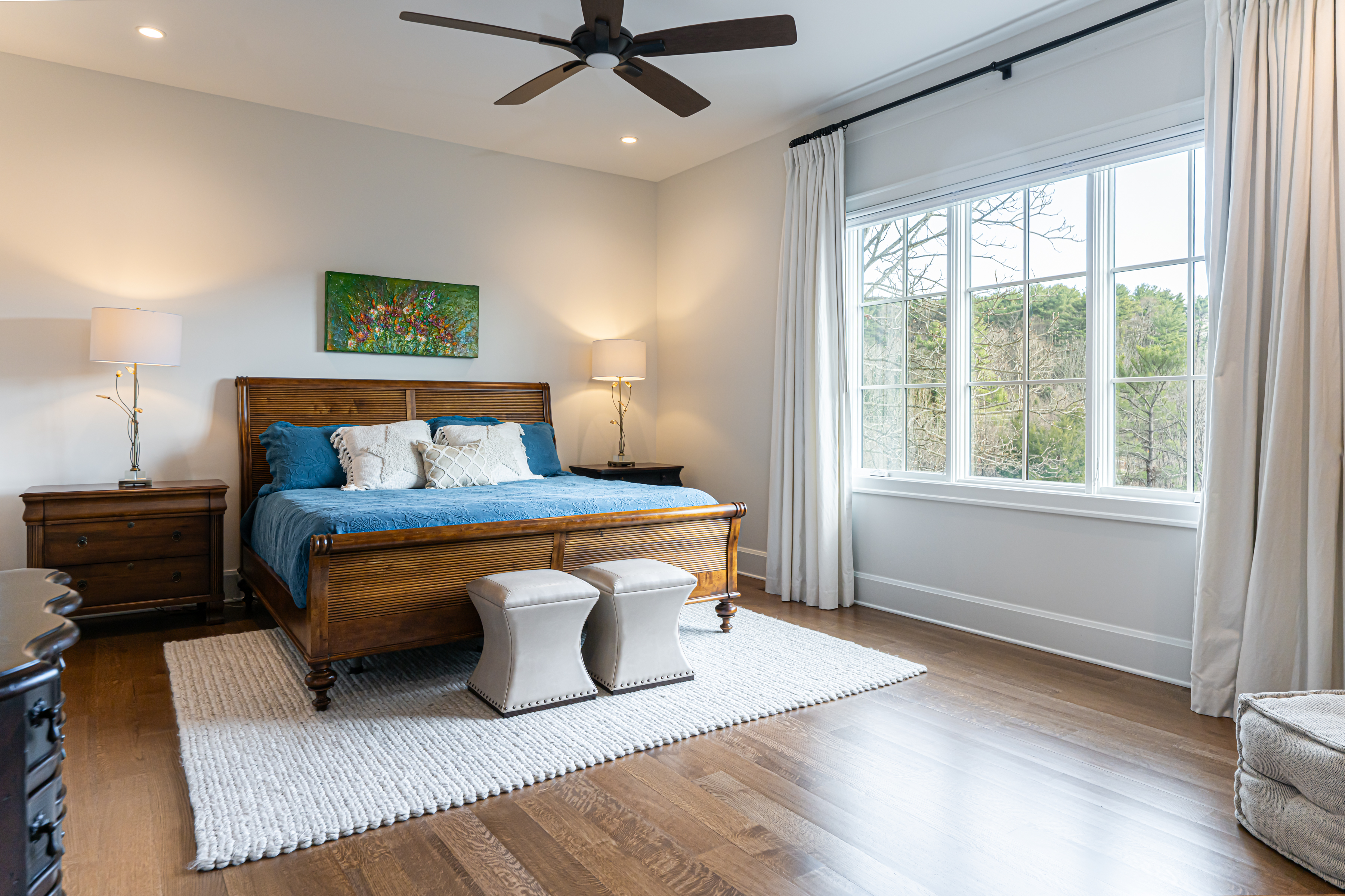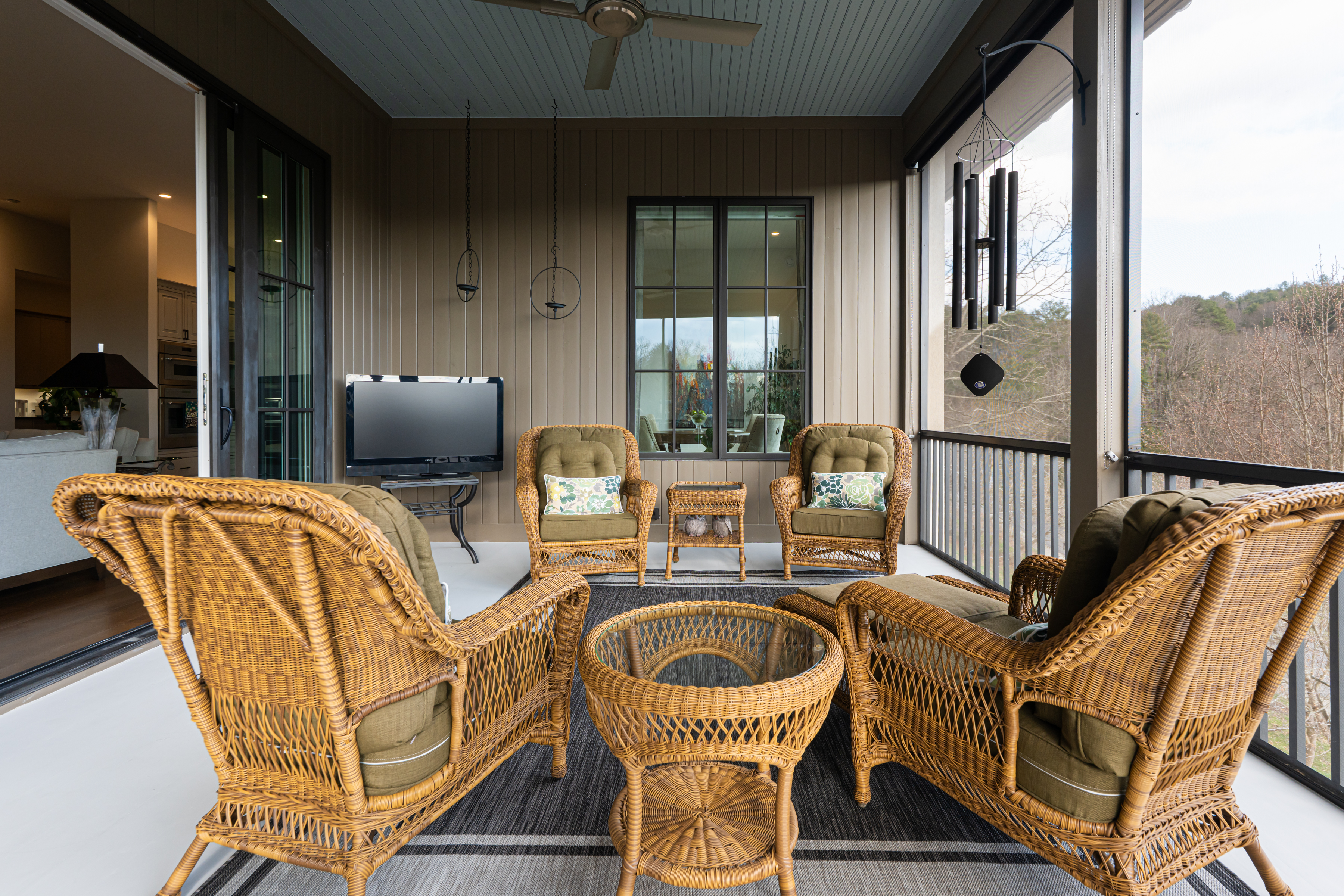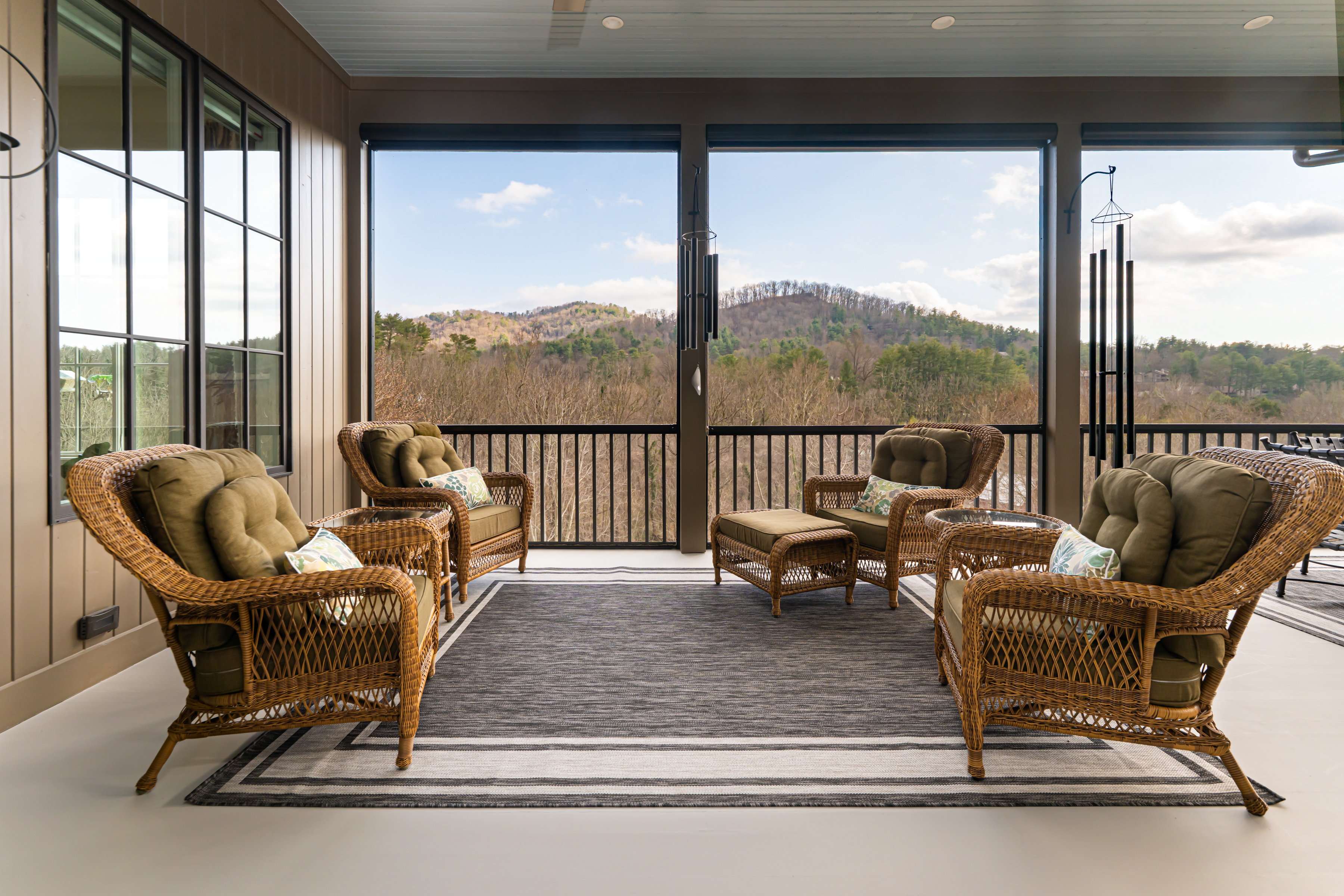 Built by Asheville's J.S. Miller Construction, this one-level home is located in North Asheville's gated Thoms Estate. The home features 5-inch white oak flooring throughout, antique brass fixtures, custom cabinetry, and LED art lights. High ceilings and views from nearly every room create an open, airy feel. The living room includes a multi-colored electric fireplace and modern built-ins, with direct access to a large screened porch overlooking the Blue Ridge Mountains and Beaver Creek. An attached uncovered deck provides additional outdoor space for grilling. The kitchen is equipped with top-of-the-line Thermador appliances, Metro Quartz countertops, and custom cabinet panels.The primary suite offers a large walk-in closet that connects to the laundry room, plus a bathroom with a frameless shower and separate soaking tubThe community provides access to miles of trails, athletic courts, a community garden and an open Air Pavilion.